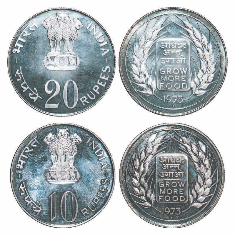 1973, Unc 2 Coins Loose, 20 & 10 Rupees, Grow More Foods, Bombay Mint, loose in individual original acrylic capsules. Unc, Scarce.