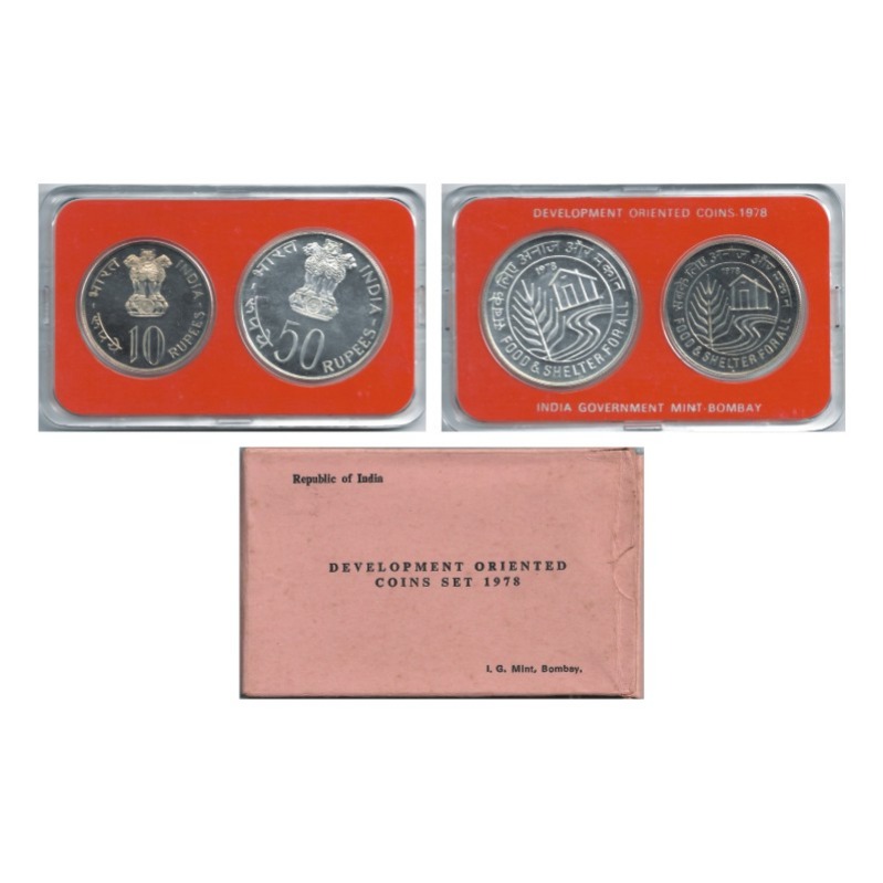 1978, Unc Coin Set, 50 & 10 Rupees, Development Oreinted Coins, Food And Shelter For All, Bombay Mint, with certificate and box Packing (gum dried in box). S. Reddappa 25.11. Unc, Scarce.