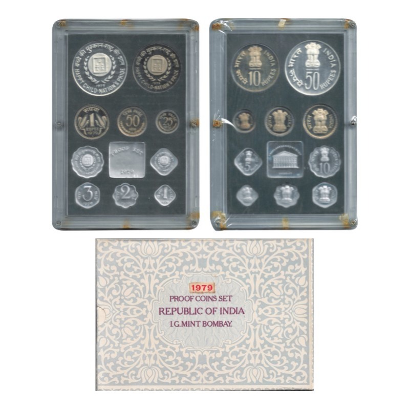 1979, Proof coin Set of 50, 10 & 1 Rupees, 50, 25, 10, 5, 3, 2, 1 Paise, Happy Child-Nation's Pride, Bombay Mint, with Cover & certificate. S. Reddappa 23.12. Proof, Scarce.