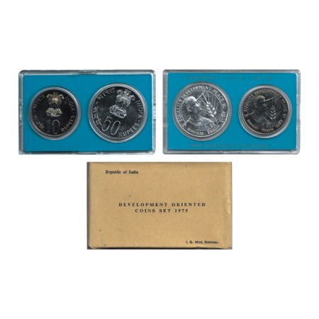 1975, Unc Coin Set, 50 & 10 Rupees, Development Oreinted Coins, Equality, Development, Peace, Bombay Mint, with certificate and box Packing. S. Reddappa 25.8. Unc, Scarce.