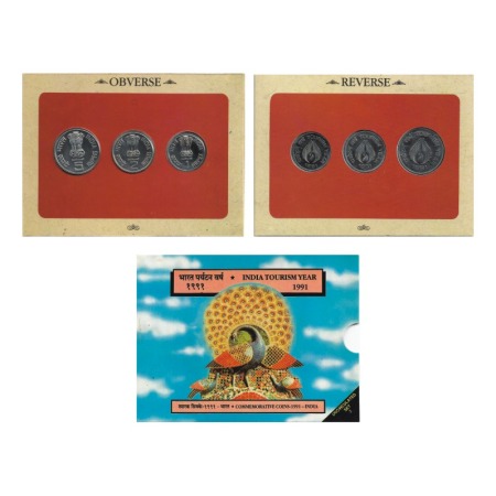1991, Unc set of 3 coins, 5 Rupees, 2 Rupees and 1 Rupee, India Tourism Year, Bombay Mint, Blistre Pack. S. Reddappa 25.24. Unc, Scarce.