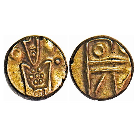 Indo Dutch, Gold Fanam, 0.38gm, Negapatnam, (1663 issue), Obv: Degenerated Kali, Rev: Degenerated Nagari legends ' Rama Raya" all different types. KM 7. Extremely Fine, Scarce.