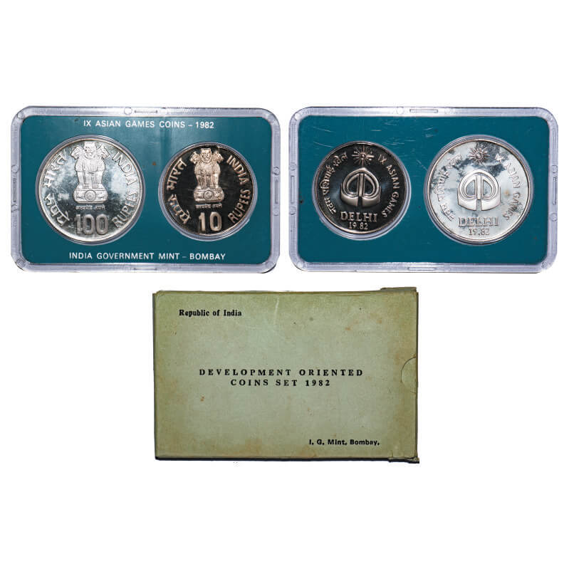1982, Unc Set, 100 & 10 Rupees, IX Asian Games, Bombay Mint, in acrylic case, with box Packing (torn) and certificate , VKG P15. Unc, Scarce.