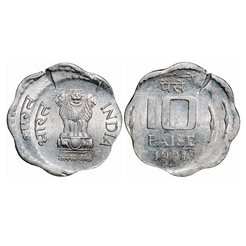 10 Paise. Aluminium, 1991, error double struck, misaligned die. About Extremely Fine, Scarce.