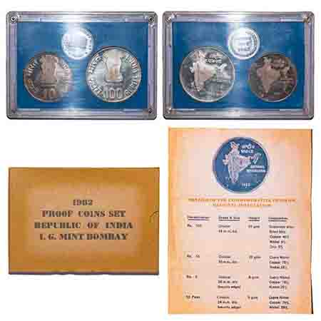 1982, Proof Coin Set, 100, 10 Rupees, National integration, Bombay Mint, with acrylic box Packing and certificate. DRRM 98. Proof, Scarce.