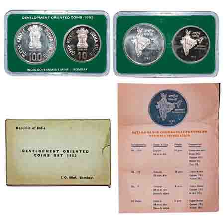 1982, Unc Coin Set, 100 & 10 Rupees, Development Oreinted Coins, National Integration, Bombay Mint, with certificate and acrylic box Packing(torn). S. Reddappa 25.14. Unc, Scarce.