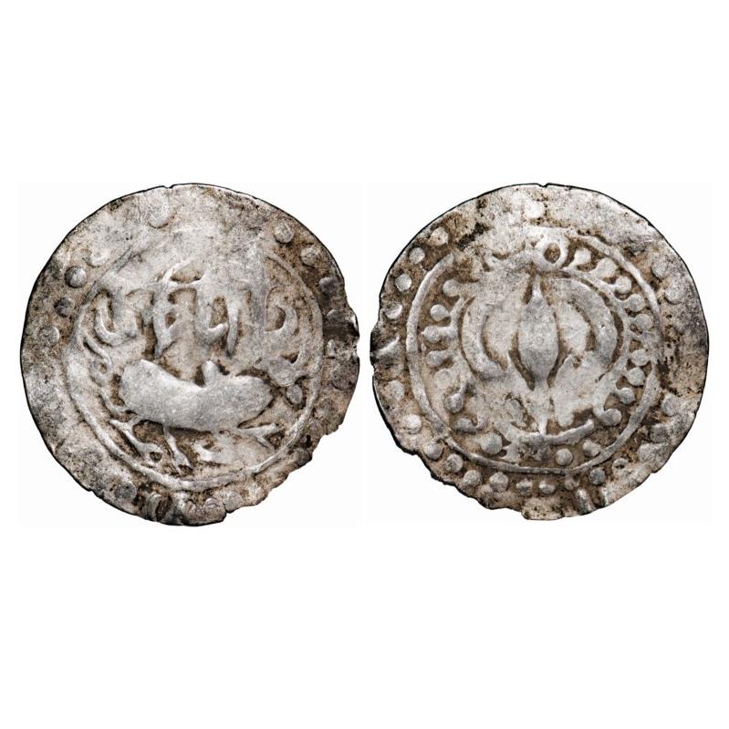 Medieval Eastern Bengal, Harikela series, (10-11 Cen AD), Silver bracteate unit, 5.90g, Obv: Bull to right, Legend above reading ‘Harikela’ in retrograde, Linear and dotted circular border around, Rev: An ornate Tripatriate (Shrivatsa?) symbol with Sun and Moon on top, Linear and dotted circular border around. Ref: Bose and Nasir, Type D, HD 10.1, pg 90, Initially the legend was read as ‘Ukeria’ by BN Mukherjee, but recently Bose and Nasir have shown that this is a retrograde legend of ‘Harikela’. Very Fine, Rare with retrograde legend.