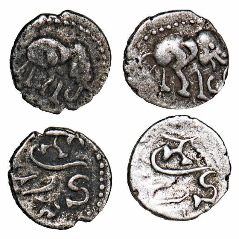 Chalukyas of Gujarat, Ranahasti, (10-11 Cen AD), (2 coins) Silver Drammas, 0.52 gm each, Obv: Elephant to right within a dotted border, Rev: Devanagari legend in two lines "ShriRana/ hasti" within a dotted border. Ref: Fishman Dammas: U8. Fine to Very Fine, Very Scarce