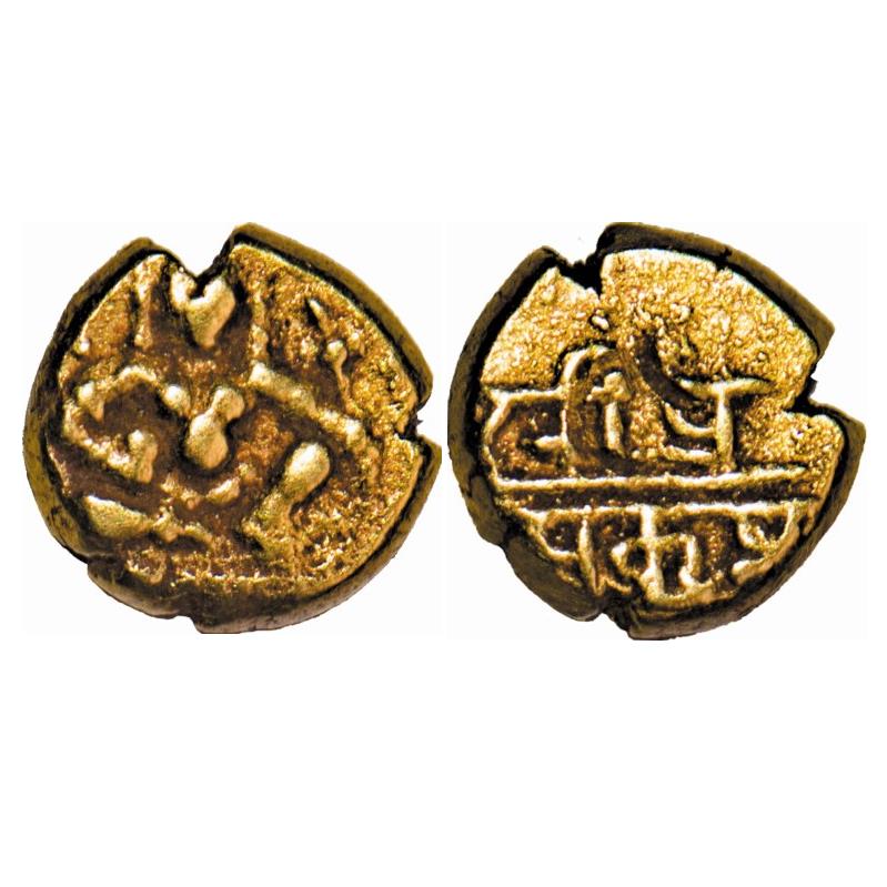 Vijayanagara kingdom, Harihara II, (1377-1404AD), Gold Pratapa (Half Varaha), 1.70g, Obv: Lord Vishnu seated in padmasana with his consort Lakshmi sitting on his left thigh, Vishnu is holding discus(chakra) and conch(Shanka), Rev: Nagari legend in three lines reading "shripra/tapahari/hara'. Ref: Studies in Vijayanagar Coins K Ganesh #26 pg 59. Extremely Fine, Rare. Haraihara II succeeded Bukka I as the Vijayanagar ruler. It was during his rule that the Wodeyars were first appointed as governors of Mysuru region.