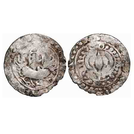 Medieval Eastern Bengal, Harikela series, Akara dynasty, Lalitakara, (10-11 Cen AD), Silver unit, 7.92g, Obv: Bull to left, Legend above reading ‘(La)litakarah’, Linear and dotted circular border around, Rev: An ornate Tripatriate (Shrivatsa?) symbol with Sun and Moon on top, Linear and dotted circular border around. Ref: Bose and Nasir, Type HC. Fine to Very Fine, Rare.