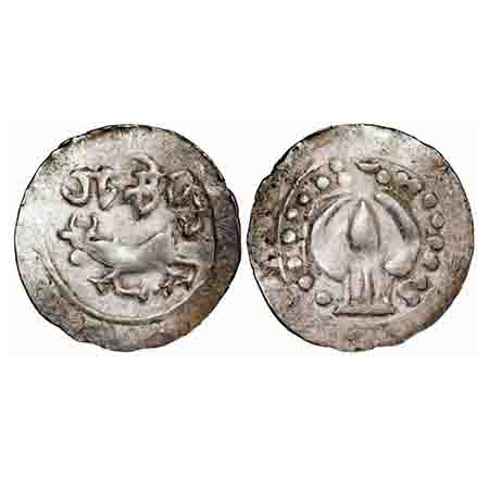 Medieval Eastern Bengal, Harikela series, Akara dynasty, Lalitakara, (10-11 Cen AD), Silver unit, 7.92g, Obv: Bull to left, Legend above reading ‘(La)litakarah’, Linear and dotted circular border around, Rev: An ornate Tripatriate (Shrivatsa?) symbol with Sun and Moon on top, Linear and dotted circular border around. Ref: Bose and Nasir, Type HC. Fine to Very Fine, Rare.
