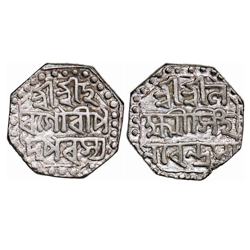 Assam, Octagonal Silver 1/16 Rupee, 0.69g, Gaurinatha Simha (1780-95), undated, Assamese legends in two lines, Obv: Sri Sri Gau/rinatha, Rev: Simha/ Nrpasya. Reverse die perfectly struck at 6 o'clock. (A.Mitra 432 types. RB. R128 types). Very Fine+, Very Scarce.