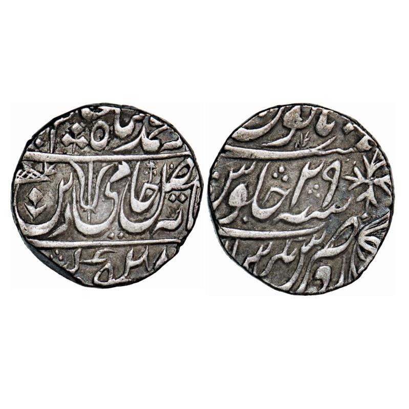 Maratha Confederacy, Silver Rupee, 10.94g, Satara Rajas, Shahjahanabad Mint, INO Shah Alam II, AH 1201/42, Obv: umbrella as mint mark, Rev: whorled star to the left of the Regnal Year, unlisted in KM. Abput Extremely Fine, Very Rare.