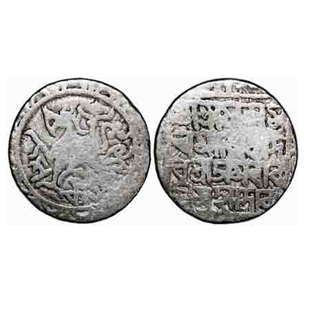 Tripura, Silver Tanka, 9.18g, Amara Manikya (1577-1586 AD) with queen Amaravati, SE 1499, Obv: Lion left with pellet added above standard. Rev: Sri Sri Yutama/ ra Manikya De/ va Sri Amarava / ti Maha Devyau in four lines within square. RB 157 type. Fine+, Rare.