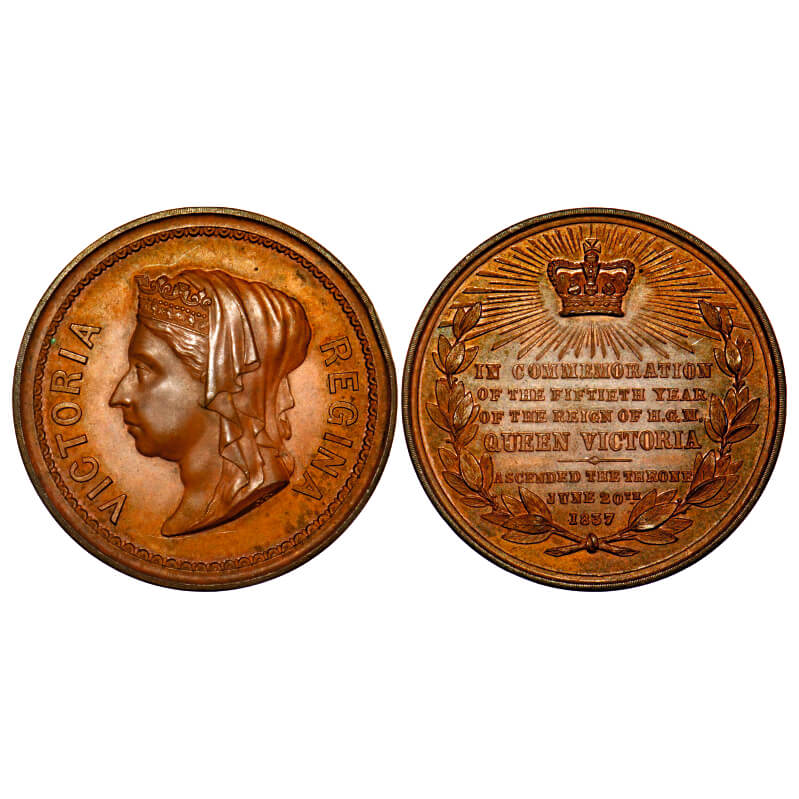 Queen Victoria Medal, Copper, 28.80g, Golden Jubilee of Queen's ascended on throne, Obv: veiled bust of Queen Victoria & VICTORIA REGINA, rev. In commemoration of the Fiftieth Year of the Reign of HGM Queen Victoria, Ascended the Throne June 20th 1837. Eimer 1296. Mint State, Very Rare.