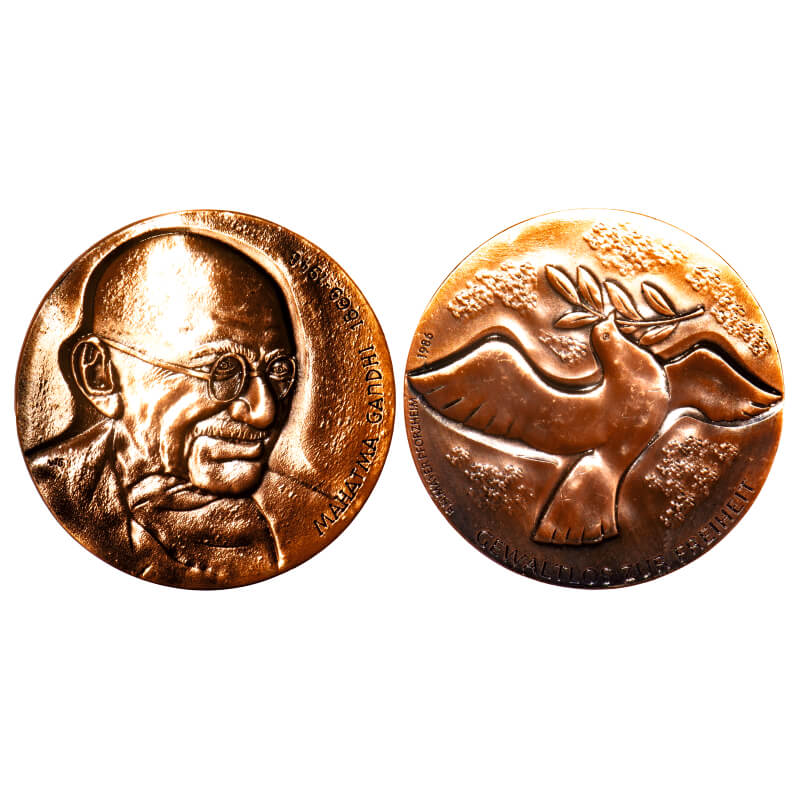 Mahatma Gandhi Medal (Germany), Bronze, 45.00g, 1986, Obv: Bust of Mahatma Gandhi 1869-1948, Rev: Peace Symbol of bird GEWALTLOS ZUR FREIHEIT, modern struck. Uncirculated, Scarce.