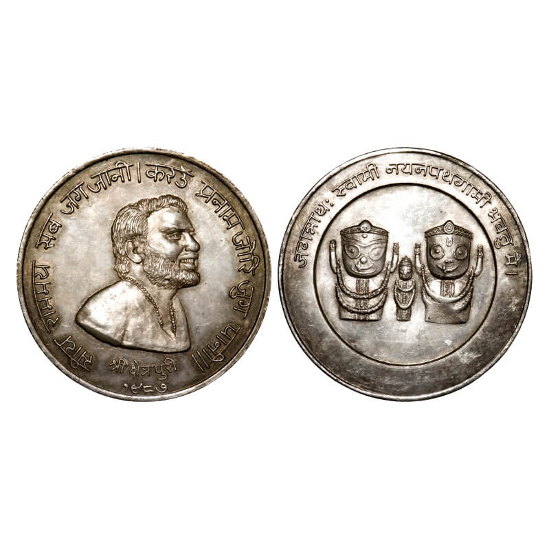 Temple Token, Silver, 89.72g, Obv: Portriat & Siya Rammay sab Jag jani karke Pranam jori jug pani II, Shri Kshetra Puri 1987, Rev: Three god faces in center & Jagannath Swami Nayanpathgami Bhavatu me I. Extremely Fine, Very Scarce.