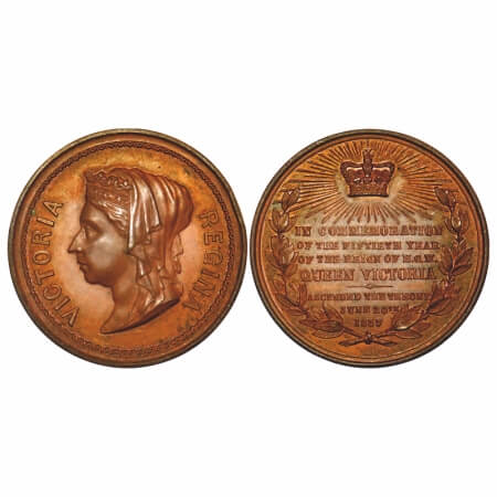 Queen Victoria Medal, Copper, 28.80g, Golden Jubilee of Queen's ascended on throne, Obv: veiled bust of Queen Victoria & VICTORIA REGINA, rev. In commemoration of the Fiftieth Year of the Reign of HGM Queen Victoria, Ascended the Throne June 20th 1837. Eimer 1296 type different. Mint State, Very Rare.