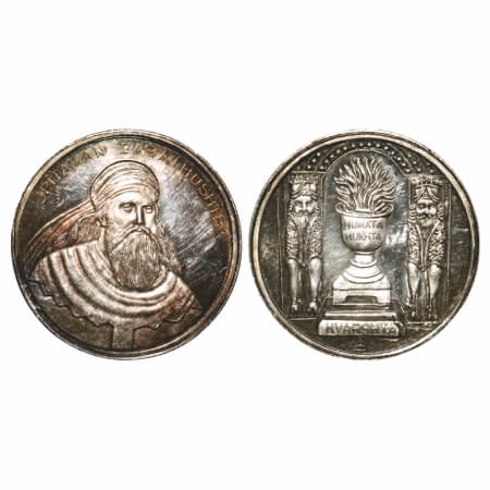 Parsi Token, Silver, 50.13g, Obv: Portrait and Pitaman Zarathushtra, Rev: Fire Altar and Animals in center with gods besides, HUMATA HUKTA, HVARSHTA below. Mint State, Rare.