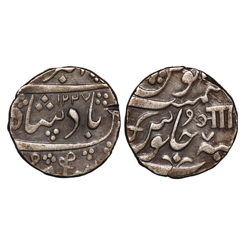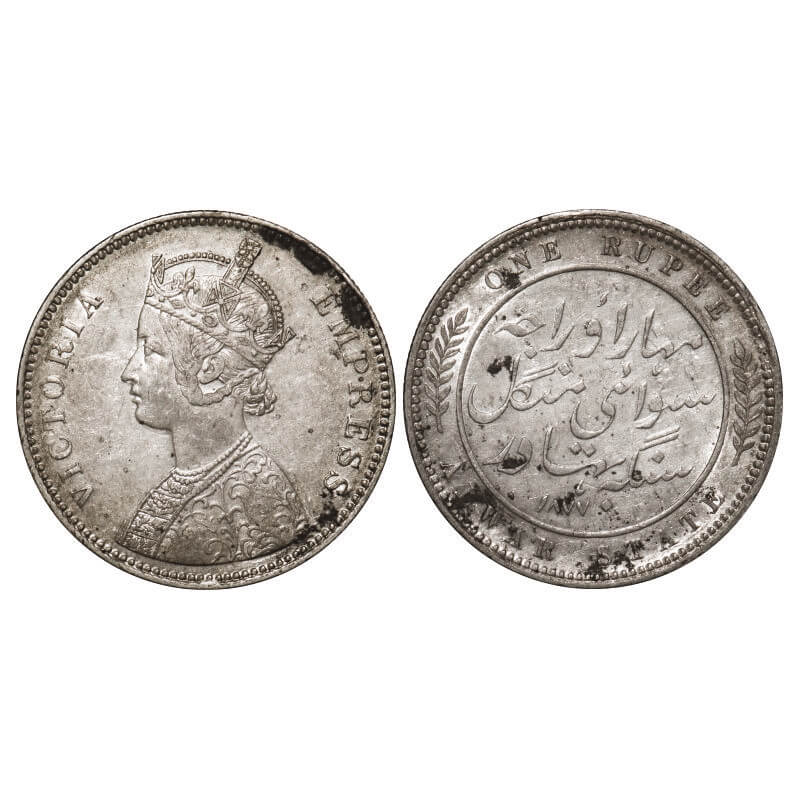 Alwar, Silver Rupee, 11.65g, Mangal Singh (1874-1892 AD), Calcutta Mint, AH 1877, Portrait of Victoria Empress, Milled coinage. KM 45. Very Fine+, Scarce.