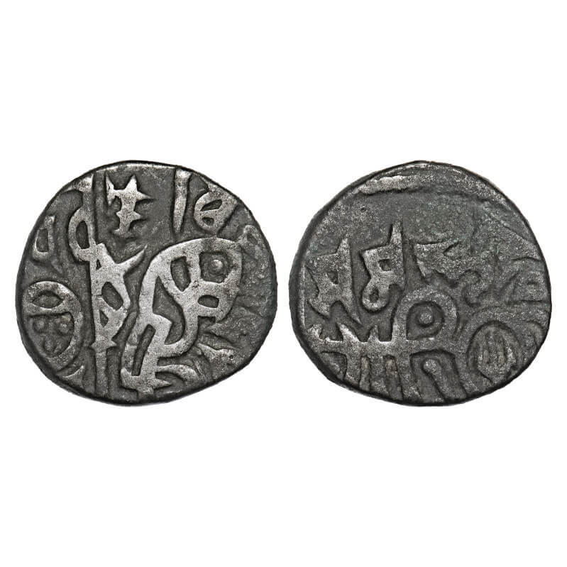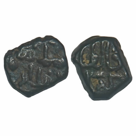Dehli Sultanate, Billon Jital, 3.41g, Muizz al din Muhammad bin Sam (AH 589-602 / 1193-1206 AD)AD) muled with chauhan ruler Prithvi Raja, Dehli type type. Obv: Stylised Bull to left sri mahamada in nagari above, Rev: horseman to right Sri Prithvi raya deva in nagari above. G&G D8. Very Fine, Rare.