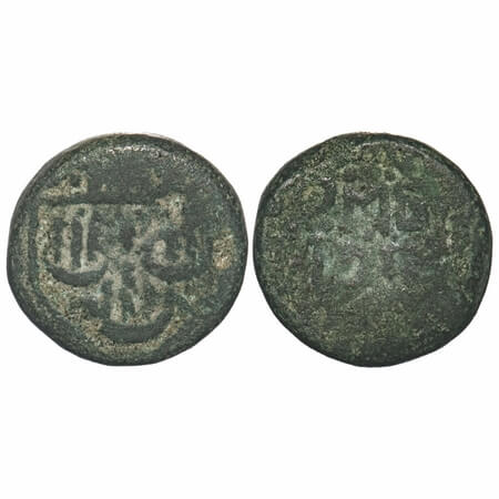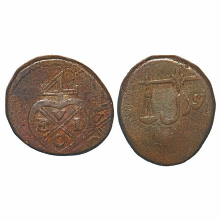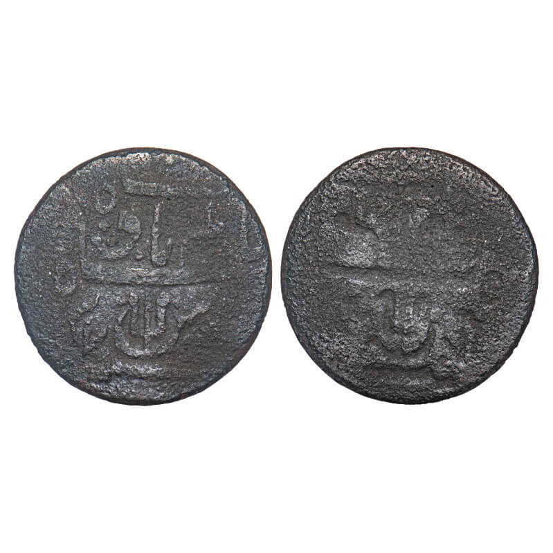 Bombay Presidency, Copper Paisa, 7.22g, Ahmedabad Mint, ND, Overstruck Error, overstruck on a previous issue, Obv: Rose flower in a “Sheen” Persian letter of Julus, Rev: Persian letter Julus, Very Fine, Rare.