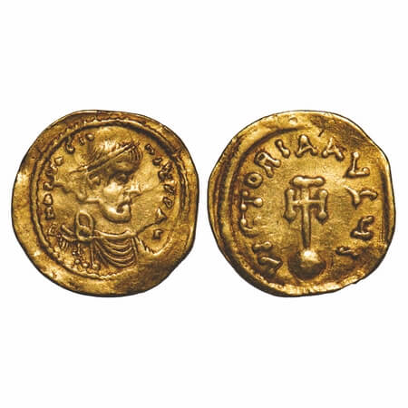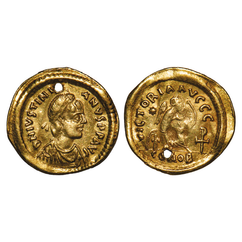 Byzantine Empire, (ca. 527-565 AD), Gold Tremissis of Justinian I, 2.10g, 18.15x18.87mm, Obv: D N IVSTINIANVS P P AVI, pearl diademed, draped, cuirassed bust right. Rev: VICTORIA AVGVSTORVM, Victory standing right, head left, holding wreath and cross on globe, star to right, mintmark CONOB. 3 pendant Holes. Very Fine+, Scarce.
