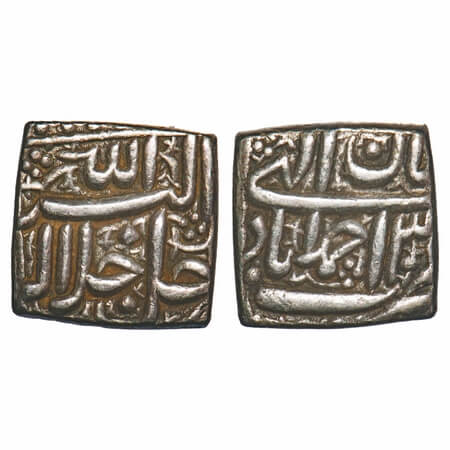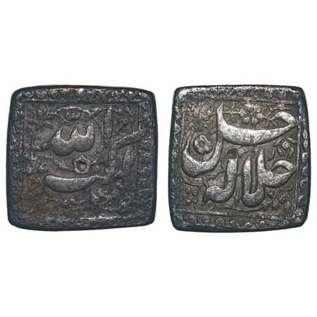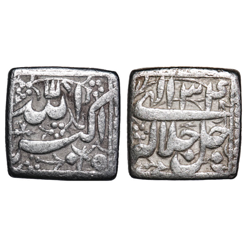 Akbar, Silver Square Rupee, 11.35g, Mintless type, Ilahi type, Month 'Di', Year 35, Obv: Allah uh Akbar, Jal Jalala, Rev: ilahi Month, year and mint at bottom, KM 90.1. Very Fine, Scarce.