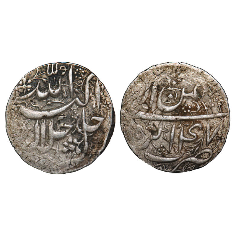 Akbar, Silver Rupee, 11.18g, Berar Mint, Ilahi type, Month 'Ardibihisht', Year 4x, Obv: Allah uh Akbar, Jal Jalala, Rev: ilahi Month, year and mint at bottom, pelleted flower mint mark below the mint. KM 93.6. About Very Fine, Scarce.
