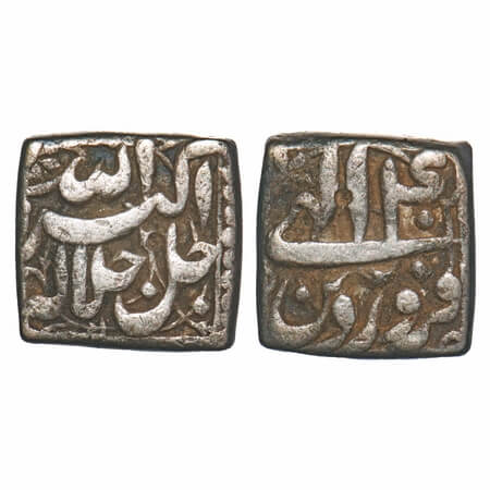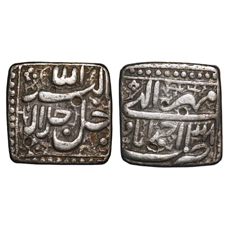 Akbar, Silver Square Rupee, 11.22g, Mintless type, Ilahi type, Month 'Farwardin', Year 40, Obv: Allah uh Akbar, Jal Jalala, Rev: ilahi Month, year and mint at bottom. KM 90.1. Very Fine, Scarce.