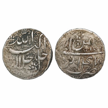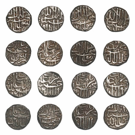Akbar, Silver Mahmudi, 8 (Coins), mintless type (Mulher type/Mayurigiri), with different dates. KM Unlisted. Scarce.