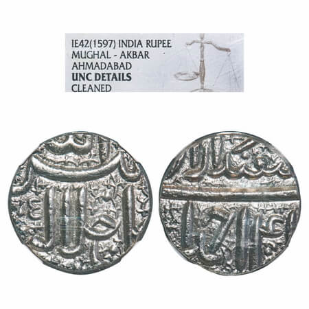 Akbar, Silver Rupee, Ahmadabad Mint, Ilahi month 'Isfandarmuz', 4(2) RY. KM 93.2. NGC graded Unc Details, Scarce.