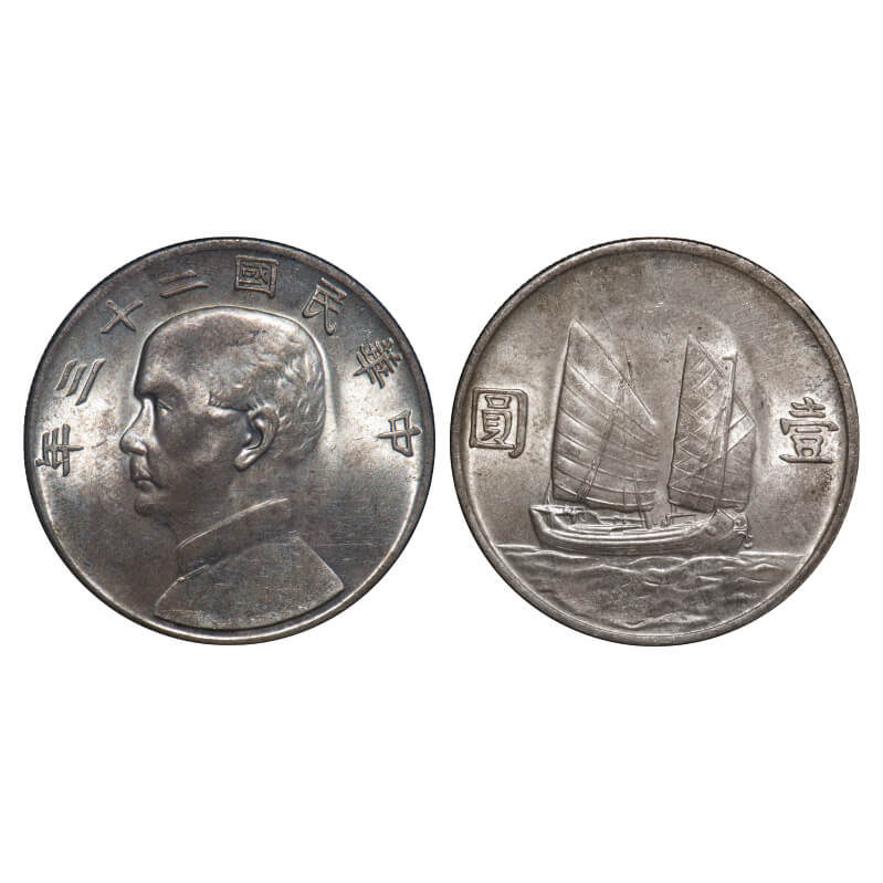 China, (0.8800 silver) Dollar (Yuan), 25.66, Year 23 (1934 AD), Sun Yat Sen, Obv: Bust to left with 8 characters above, Rev: Junk (Boat) and rising sun, Denomination. Y # 345. Uncirculated, Rare.