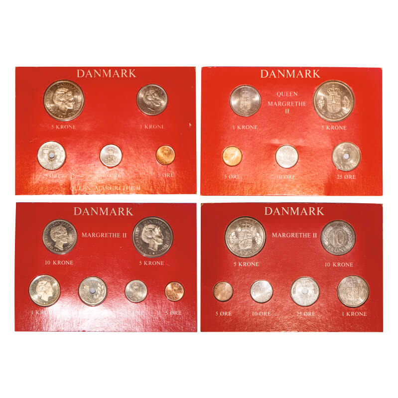 Danmark, Set of 6 coins UNC (2 sets), Mixed Metals (Cupro-Aluminium-Nickel), Queen Margrethe II, 1) 1974, 5,1 Kroner & 25,10,5 Ore, 2) 1987, 10,5,1,Kroner & 25.10,5 Ore, in blister packing. Uncirculated. Scarce.