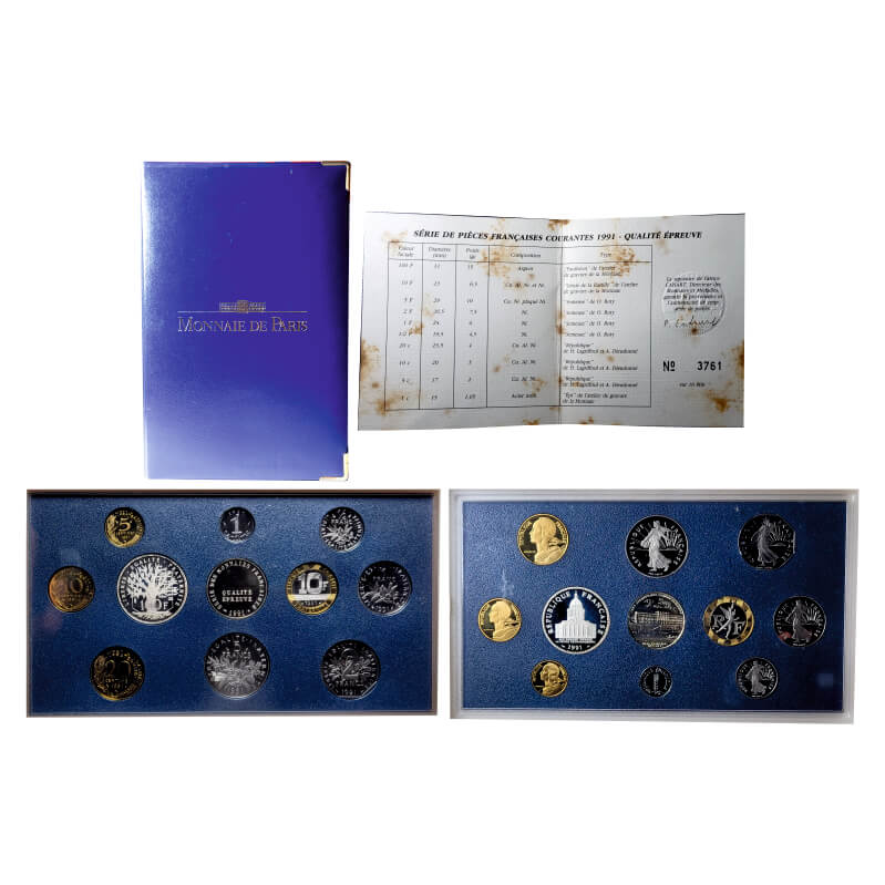 France, Francs set, 11 Proof coins, Mixed Metals, 1991, Paris Mint, 100 Franc (0.900% Silver), 10, 5, 2, 1, 1/2 franc (Cu-Ni), 20,10,5,1 Cent (Copper Aluminium). Proof in Acrylic case with certificate and box. Proof, Scarce.