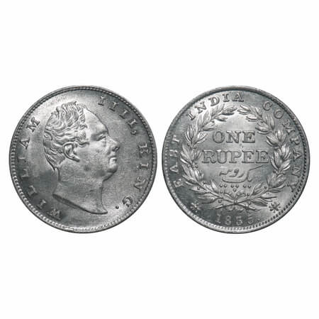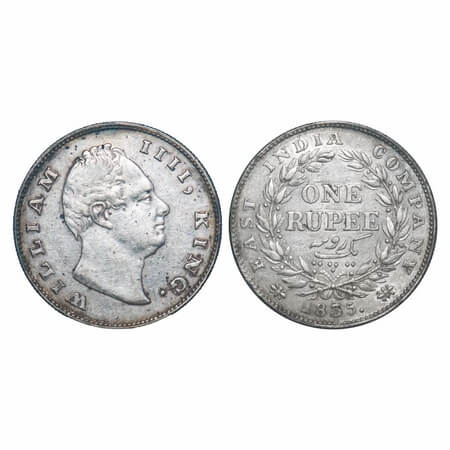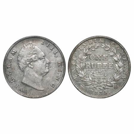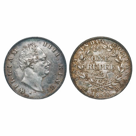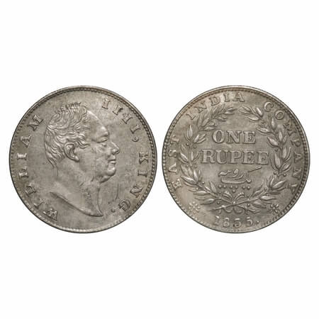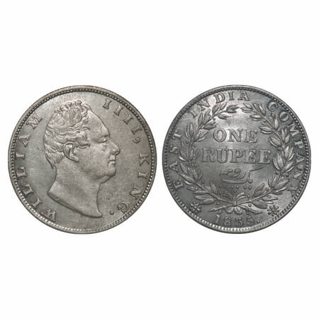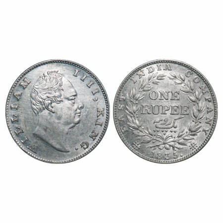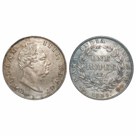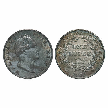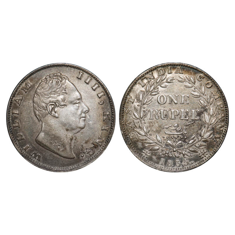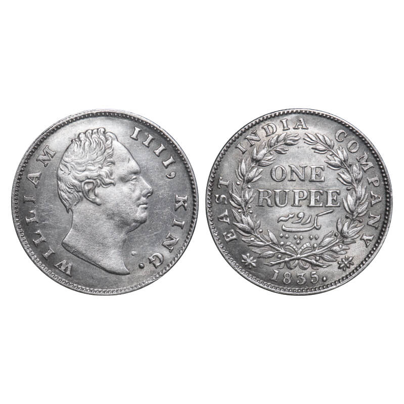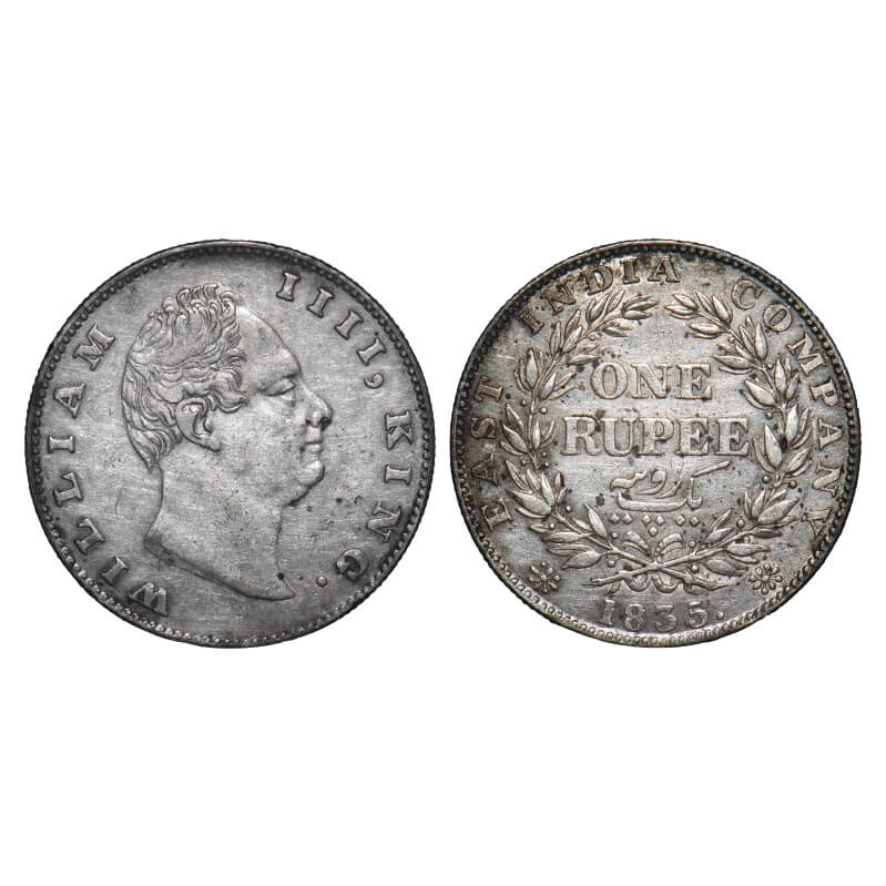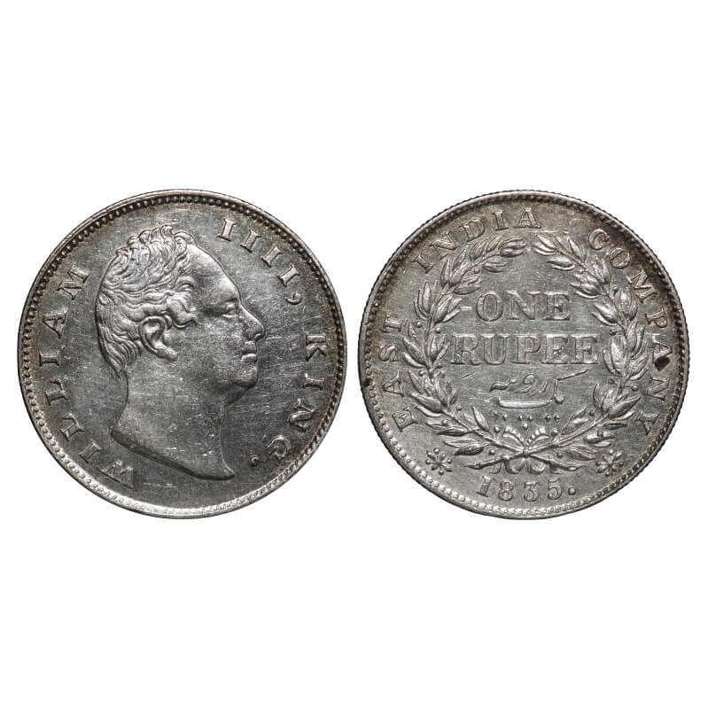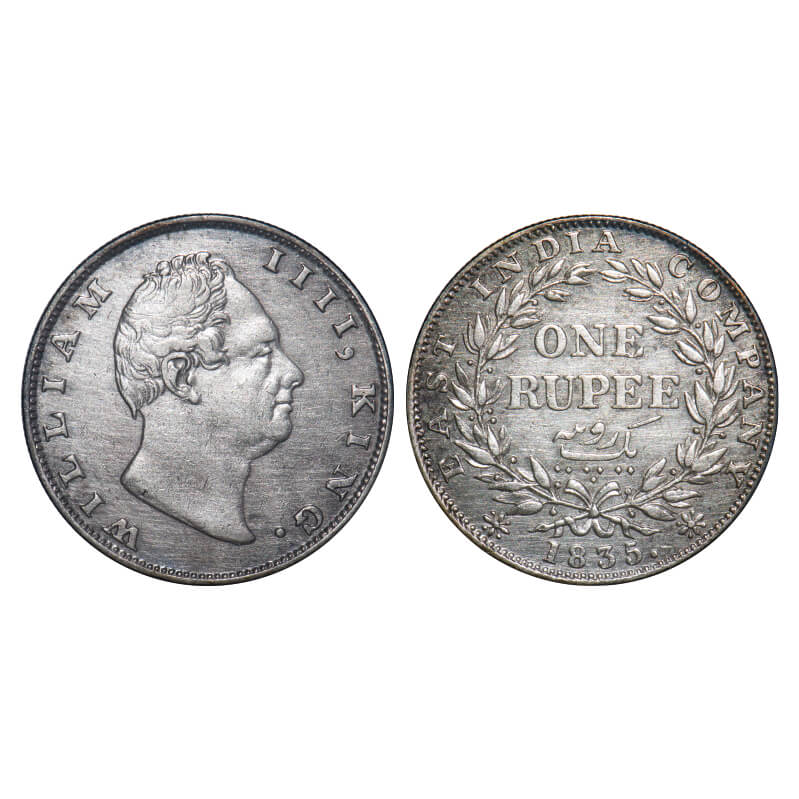 William IV, Silver, Rupee, 1835, Calcutta Mint, A/II, 'F' incused, Rev aligned, Wreath with 19 Berries (10L + 9R). F. Prid 34. GK 14. About Uncirculated. Very Scarce.