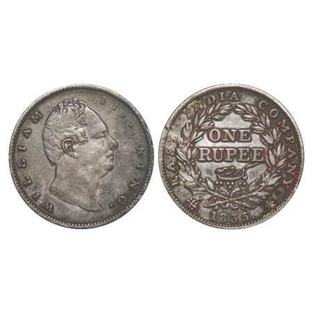 William IV, Silver, Rupee, 1835, Calcutta Mint, A/I, F raised, Rev aligned, Wreath with 19 Berries (10L + 9R). F. Prid 37. GK 30. Very Fine. Scarce.