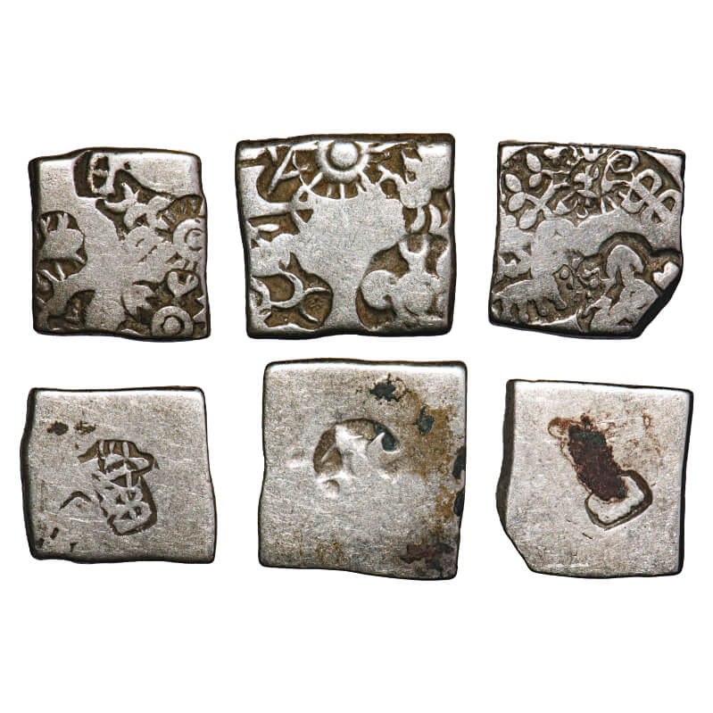 Punch Marked Coins, Mauryan Period, Silver Karshapana (3 coins), G/H series V, five symbol type, Obv: Including Sun, six armed, three arched hill above crescent, bull, fish and geoemetric symbol, Rev: Banker marks. Very Fine, Scarce.