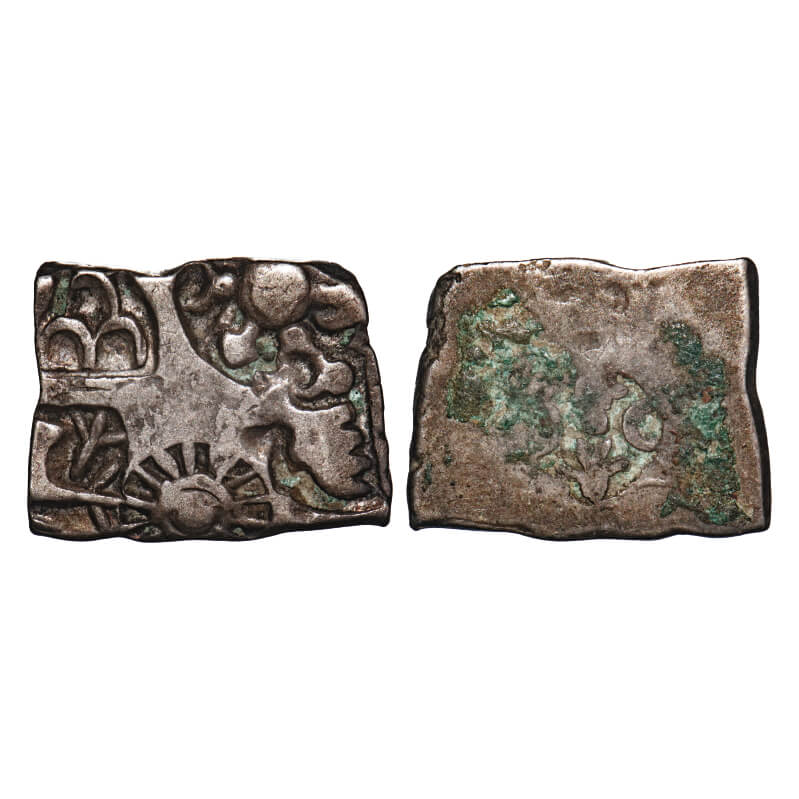 Mauryan Period, Silver Karshapana, 3.26g, 13.78x17.65mm, G/H series VII, five symbol type, Obv: Sun, six armed, bull, three arched hill and fish symbol, Rev: Blank. Very Fine, Scarce.