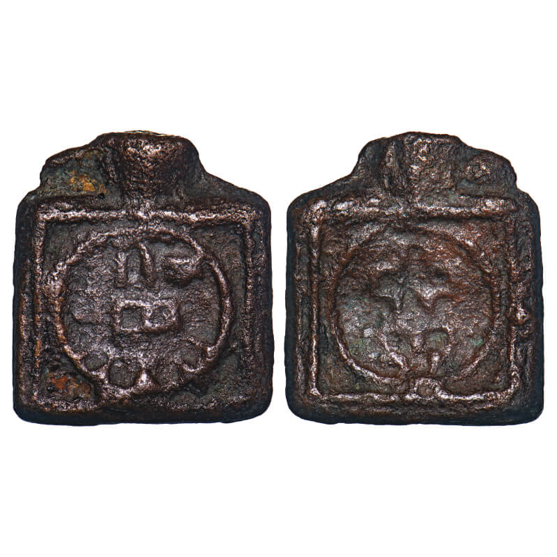 Mauryan Period (c. 350-250 BC), Vidarbha region (Paoni area), Cast Copper, 8.78g, 22.77x20.04mm Obv: Three arched hill within circle, Rev: Three arched hill below hollow cross within circle. Pieper # 377. About Very Fine, Scarce.