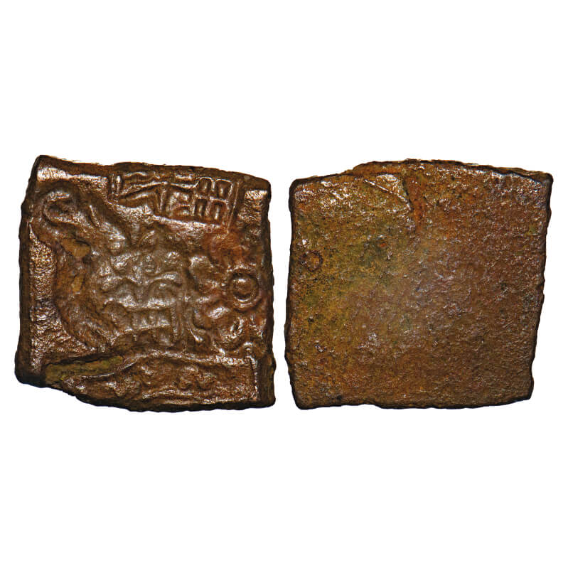 Post-Mauryan, Punch Marked, Vidisha Region, Uninscribed type, Copper Karshapana, 3.52g, 16.09x16.77mm, Obv: Horse, tree-in-railing, lotus flower, indradhvaja in railing and river with fishes, Uniface. Pieper # 882. Very Fine, Scarce.