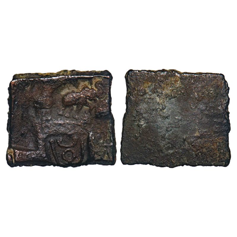 Post-Mauryan, Punch Marked, Vidisha Region, Uninscribed type, Copper Karshapana, 4.29g, 17.68x19.68mm, Obv: Elephant to right with trunk upraised, taurine in arched and indradhvaja symbol, Uniface. Pieper # 874. About Very Fine, Scarce.
