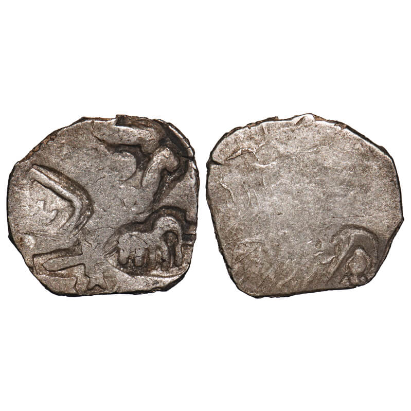 Archaic Punch Marked, attributed to Kosala Janapada(c. 525-465 BC), Silver Karshapana, 2.64g, 15.62x16.77 mm, ABCD type, Obv: Elephant, five pointed star, taurine within frame and English word ‘S’ type symbol, Rev: Banker mark. Rajgor # Series 65. About Very Fine, Scarce.