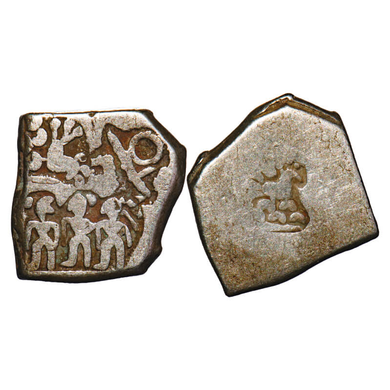 Punch Marked Coins, Mauryan Period, Silver Karshapana, 3.36g, 13.5x4.44mm, G/H series V, five symbol type, Obv: Sun, six armed, elephant, six arched hill taurine in each arch and bull within square area flanked by taurine, Rev: Traces of banker mark. Gupta & Hardaker # 501. Very Fine, Scarce.
