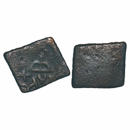 Post-Mauryan, Saurashtra Region (Gujarat), Copper Fraction. 3.72g, 15.33x15.27mm, Obv: Human figure holding stick beside six armed symbol, Rev: Bold swastika symbol. Pieper # 494. About Very Fine, Scarce.