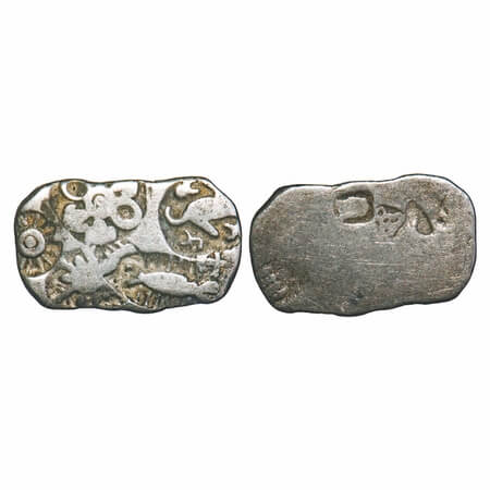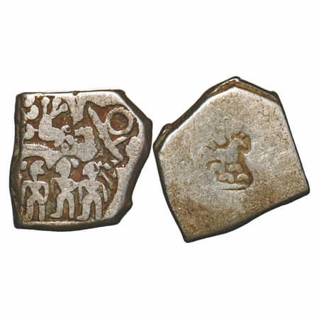 Archaic Coinage, Punch Marked, attributed to Magadha Mahajanapada (c. 600-400 BC.), Patna Region (Bihar), Silver Karshapana, 5.36g, 20.76x21.75 mm, G/H Series 0, Five symbol type, Obv: Six armed as main symbol in center and around, sun, crescent and like a mace symbol, Rev: Multiple banker marks. Rajgor # Series 10. Very Fine, Rare.