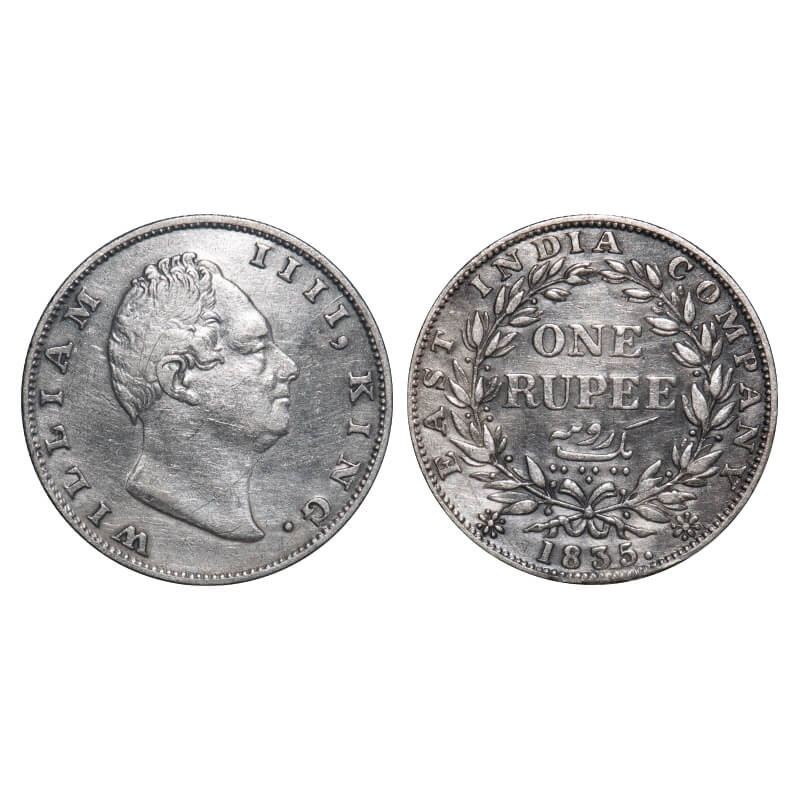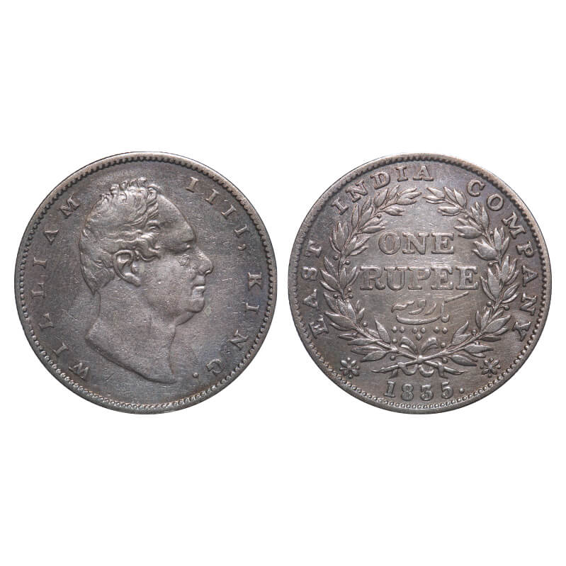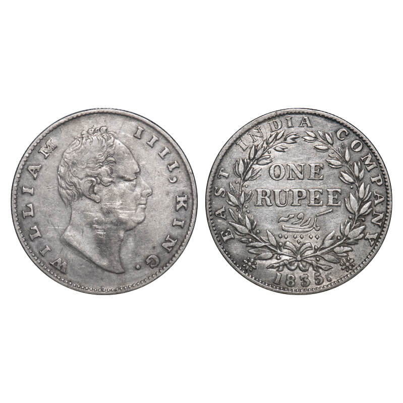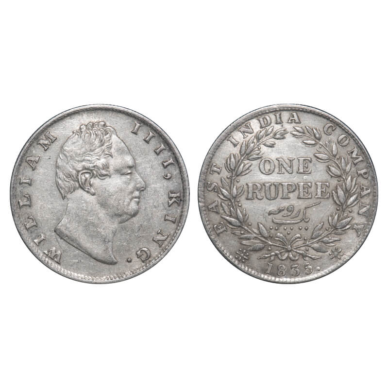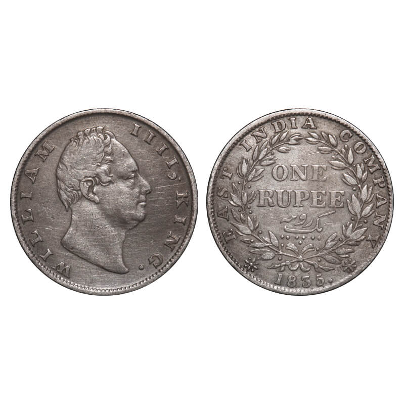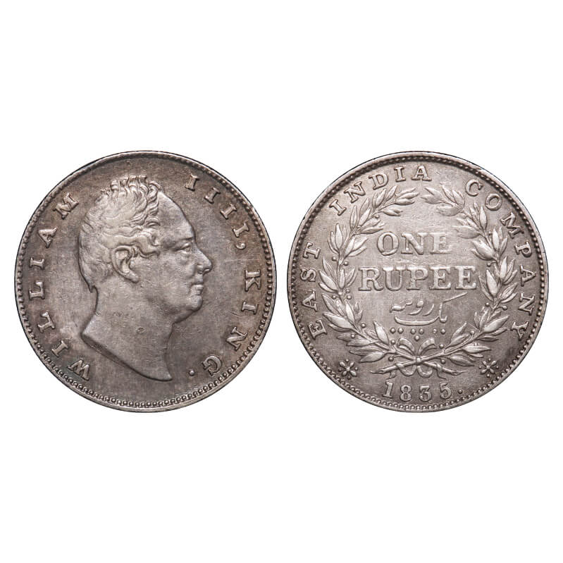William IV, Silver, Rupee, 1835, Calcutta Mint, A/III, 'F' incused, Large and thick letters of the legend, With bud leaves above 'E' of One, Wreath with 19 Berries (10L + 9R), Mechanical die doubling of numerals 3 & 5 of year date 1835. F. Prid 34. GK 11. Very Fine+. Very Scarce.