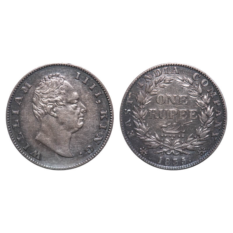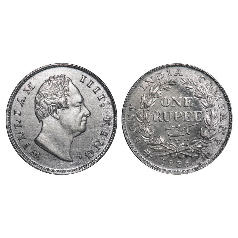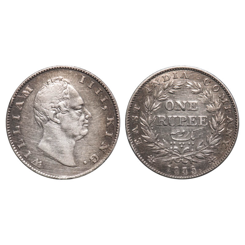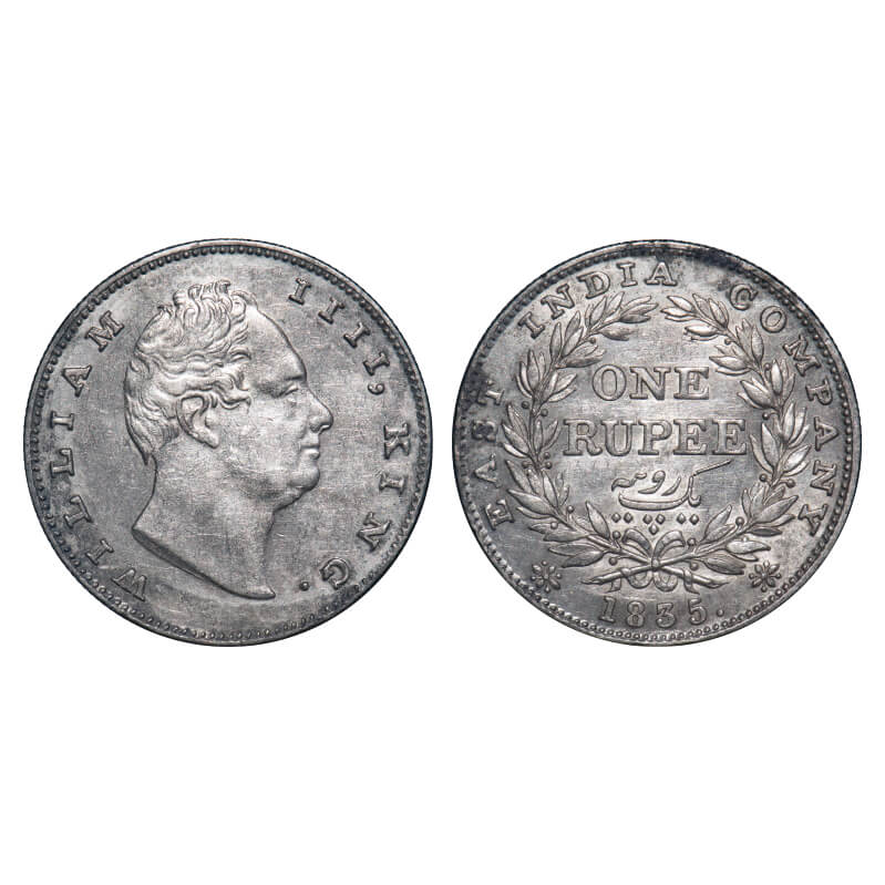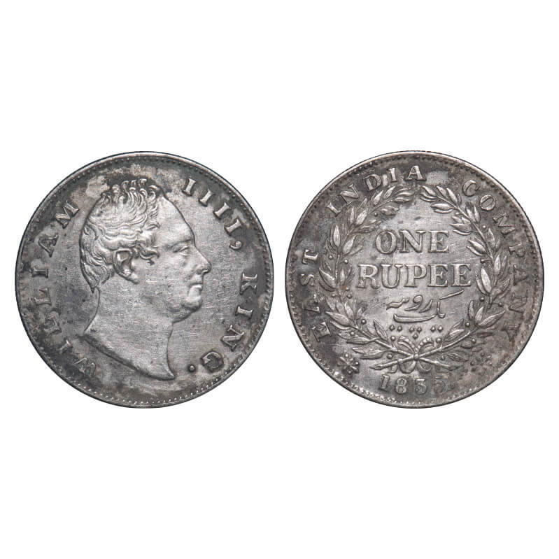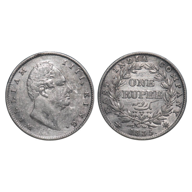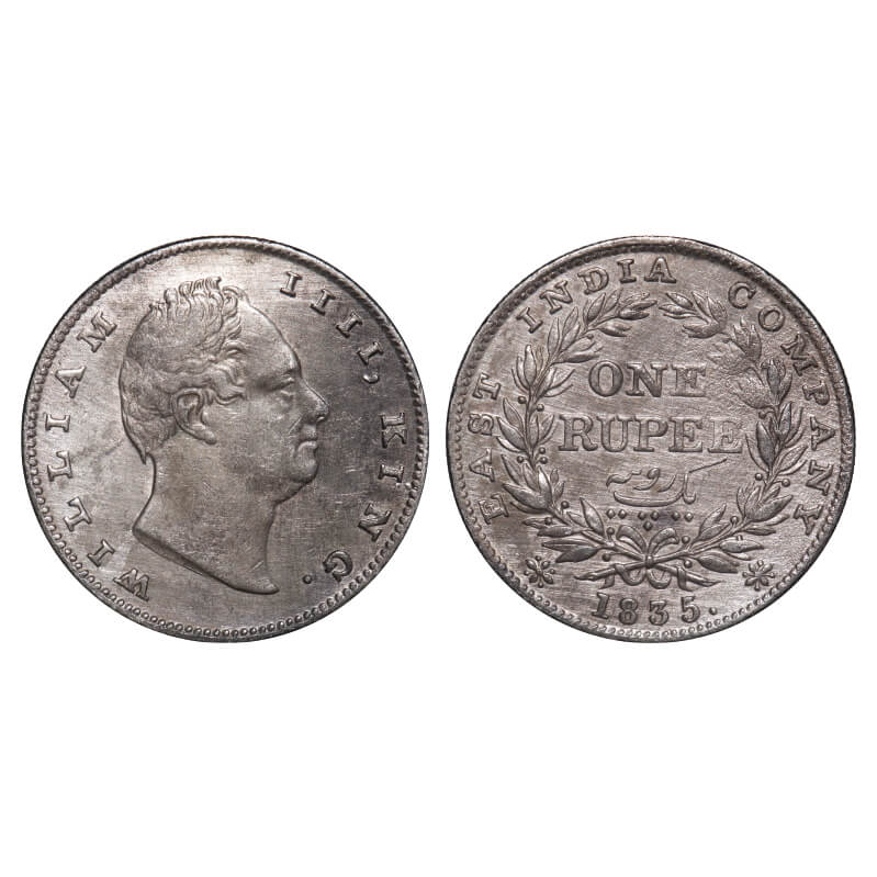 William IV, Silver, Rupee, 1835, Calcutta Mint, A/III, 'F' incused, Large and thick letters of the legend, With bud leaves above 'E' of One, Wreath with 19 Berries (10L + 9R), Mechanical die doubling of numerals 3 & 5 of year date 1835. F. Prid 34. GK 11. Very Fine+. Very Scarce.