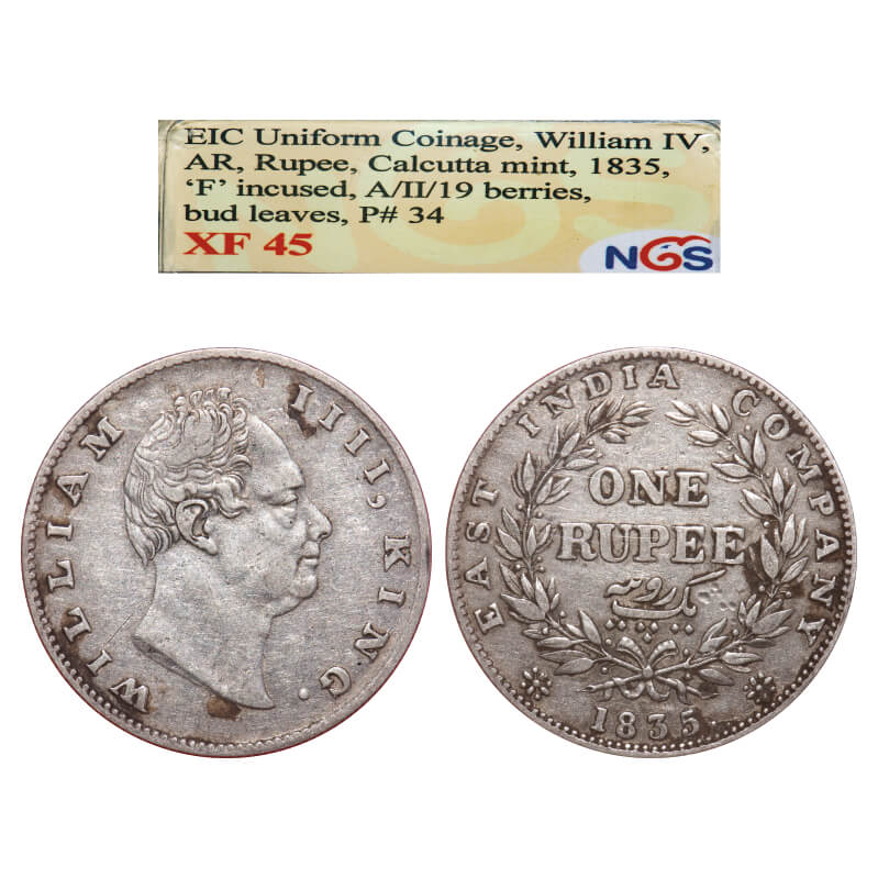 William IV, Silver, Rupee, 1835, Calcutta Mint, A/II, 'F' incused, Rev aligned, Large and thick sized letters of the legend, With bud leaves above 'E' of One, Wreath with 19 Berries (10L + 9R). F. Prid. 34. GK 14. NGS Slabbed XF 45. Rare.