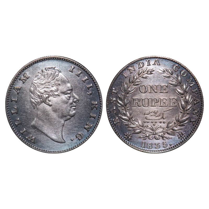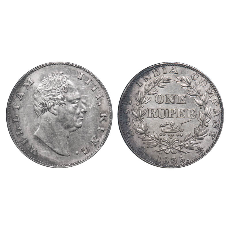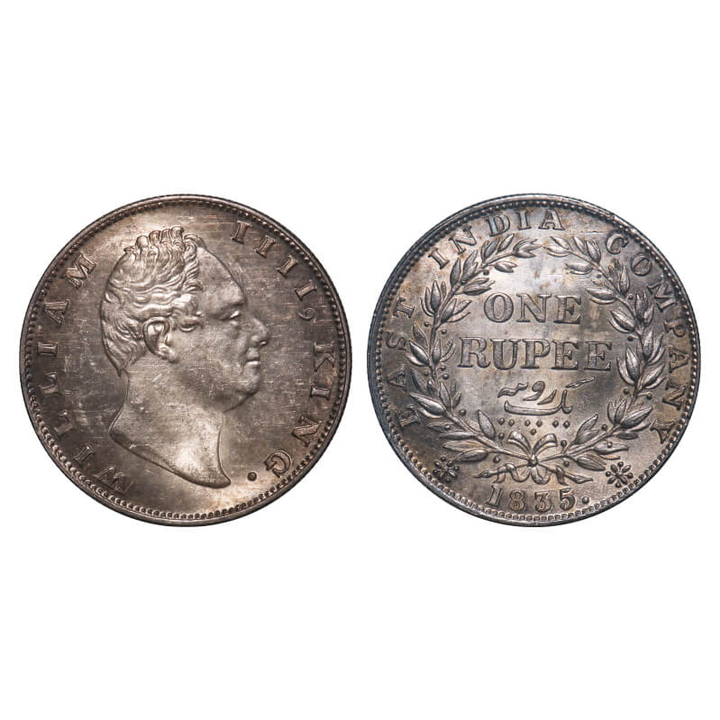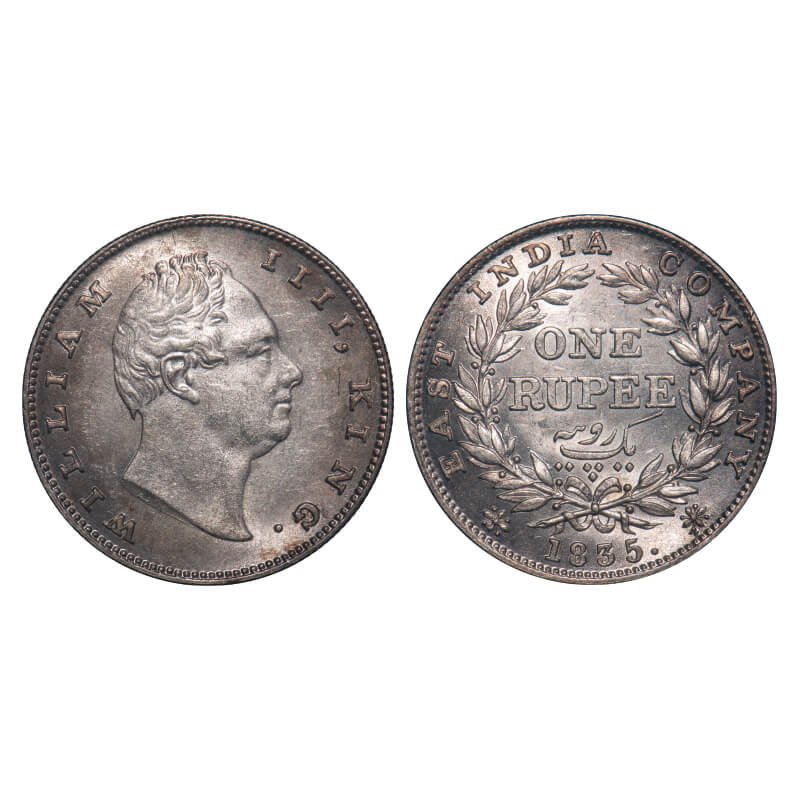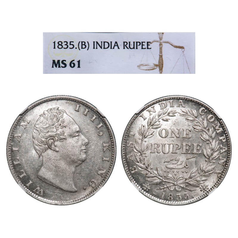 William IV, Silver, Rupee, 1835, Calcutta Mint, A/III, Dugout f, Large and thick sized letters of the legend, Leaf tip in the wreath falls very much short of 'T' in East, With bud leaves above 'E' of One, Wreath with 19 Berries (10L + 9R), The coin is of Calcutta Mint wrongly mentioned as Bomaby Mint on the slab. F. Prid Unlisted. GK 27. NGC Slabbed MS 61. Very Rare. (17 coins graded higher by NGC in this category till 10/9/2025)